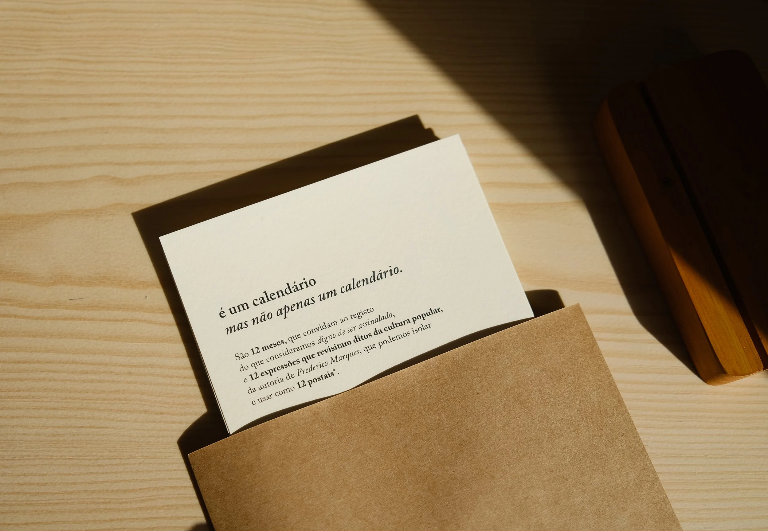 Este calendário é formado por: 1 envelope em papel kraft (que nos permite depois guardar os meses rabiscados e cheios de memórias) + 12 meses (e respectivo verso para completar) + uma base de madeira (que serve de suporte de mesa aos meses/provérbios). Pode, para quem já adquiriu no ano anterior, ser comprado também apenas o miolo, sem base.