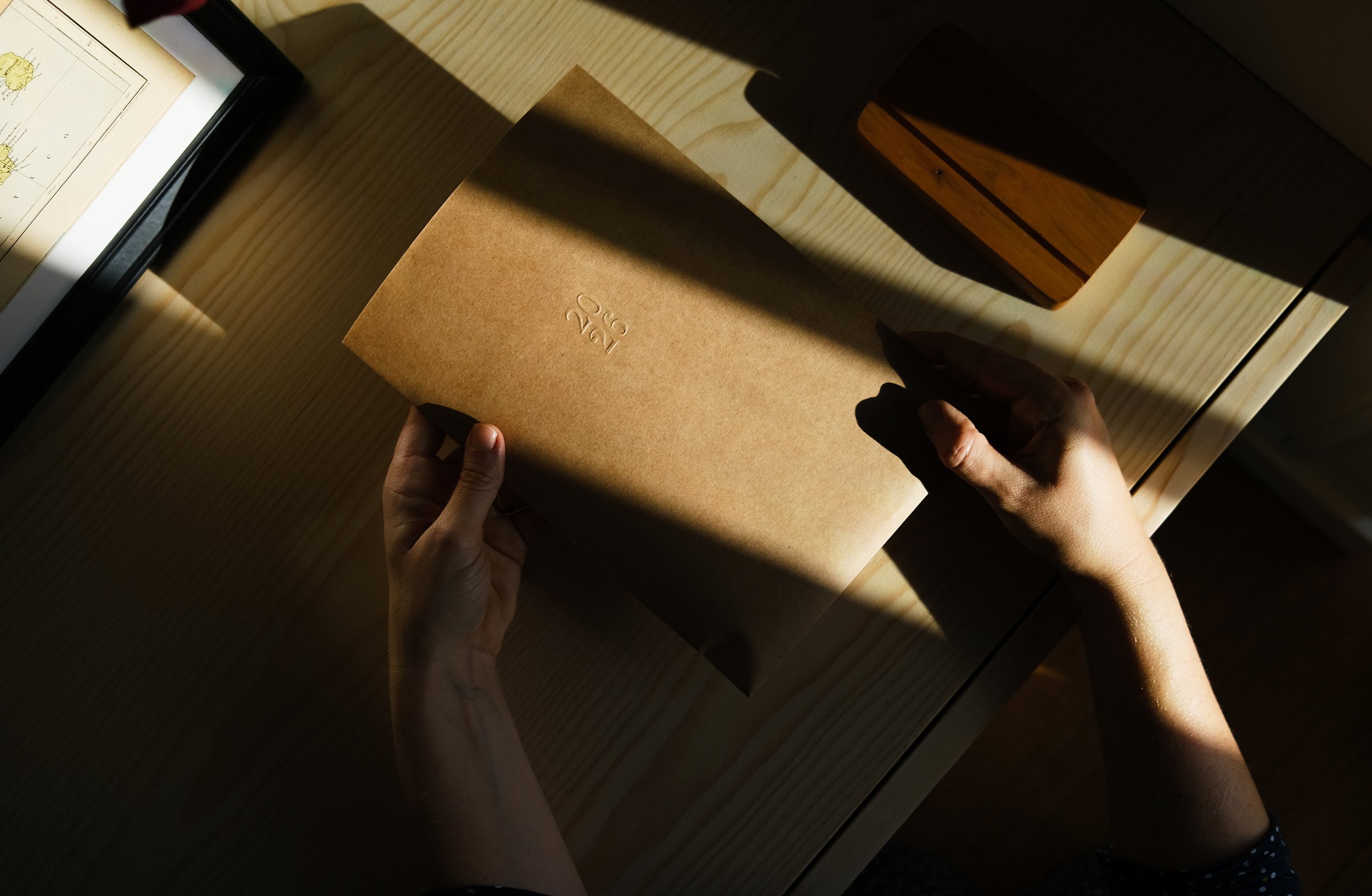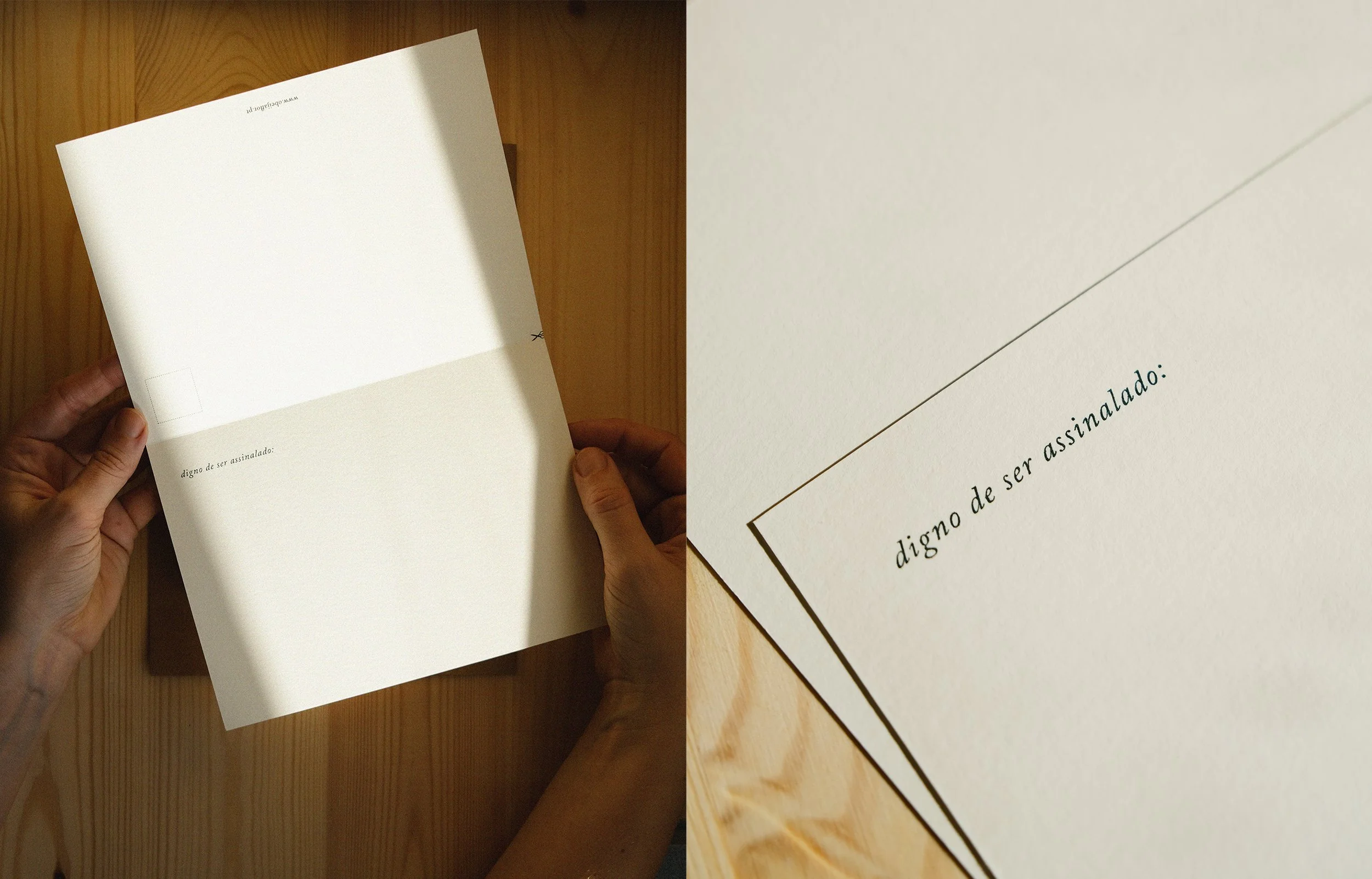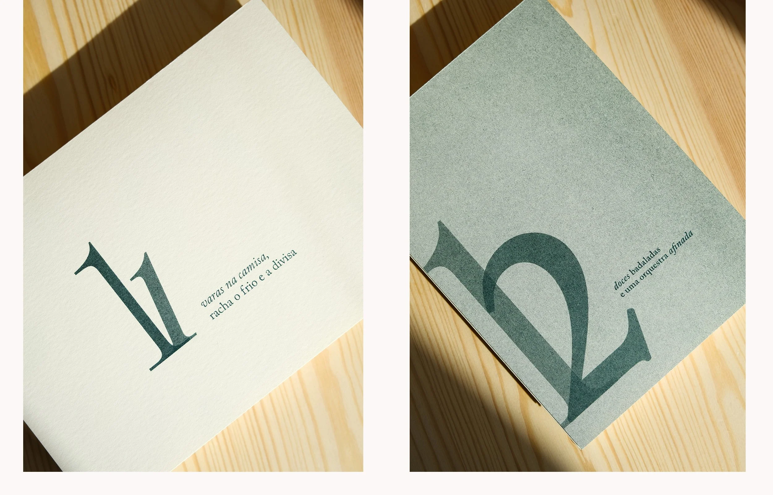 Detalhes do acabamento em alto relevo (a seco, sem cor) da frente e do verso do envelope que guarda os 12 meses de 2026.