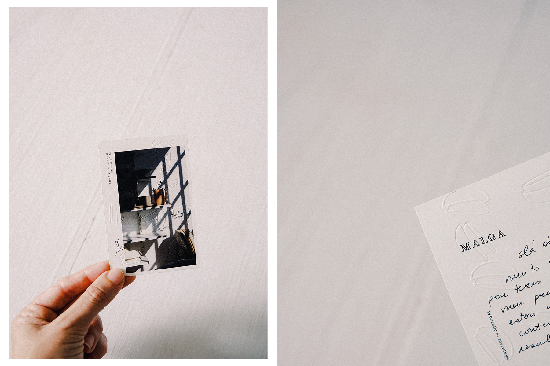 Depois de vários estudos, testes e soluções - que permitiriam à Mariana ter um conjunto de suportes físicos que se complementariam entre si - chegámos a um conjunto simples, minimal e delicado - o reflexo da Malga. Aqui fica os cartões de agradecimento, que acompanham as encomendas, com uma mensagem personalizada escrita pela Mariana. Todas as peças da Malga são feitas à mão, com todo o cuidado e detalhe, por isso fazia todo o sentido que este suporte também assim o fosse.